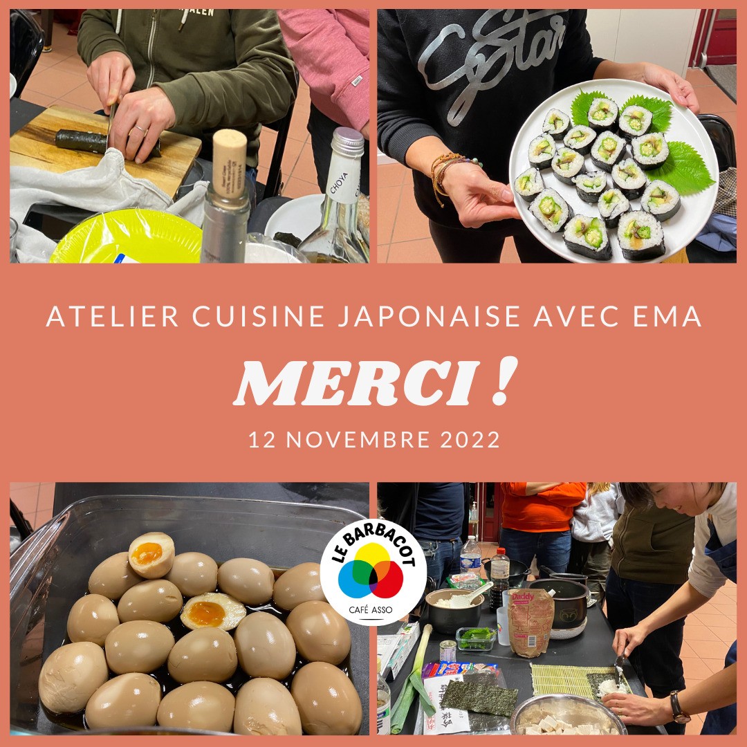 MERCI ! A Ema, adhérente du Barbacot et talentueuse cuisinière qui a su nous enseigner tout l’art des makis, des ajitsuke tamago et bien d’autres !