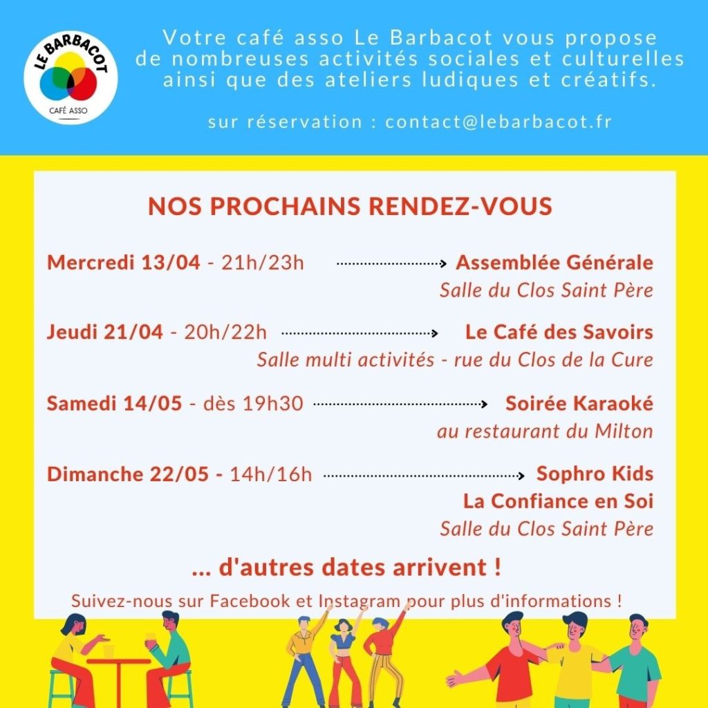 Jeudi 21 Avril de 20h à 22h, le Café des Savoirs (Salle multi-activité, ALSH, rue du Clos de la Cure), rencontres, échanges autour d’une thématique, ce mois-ci « La demande d’asile en France »