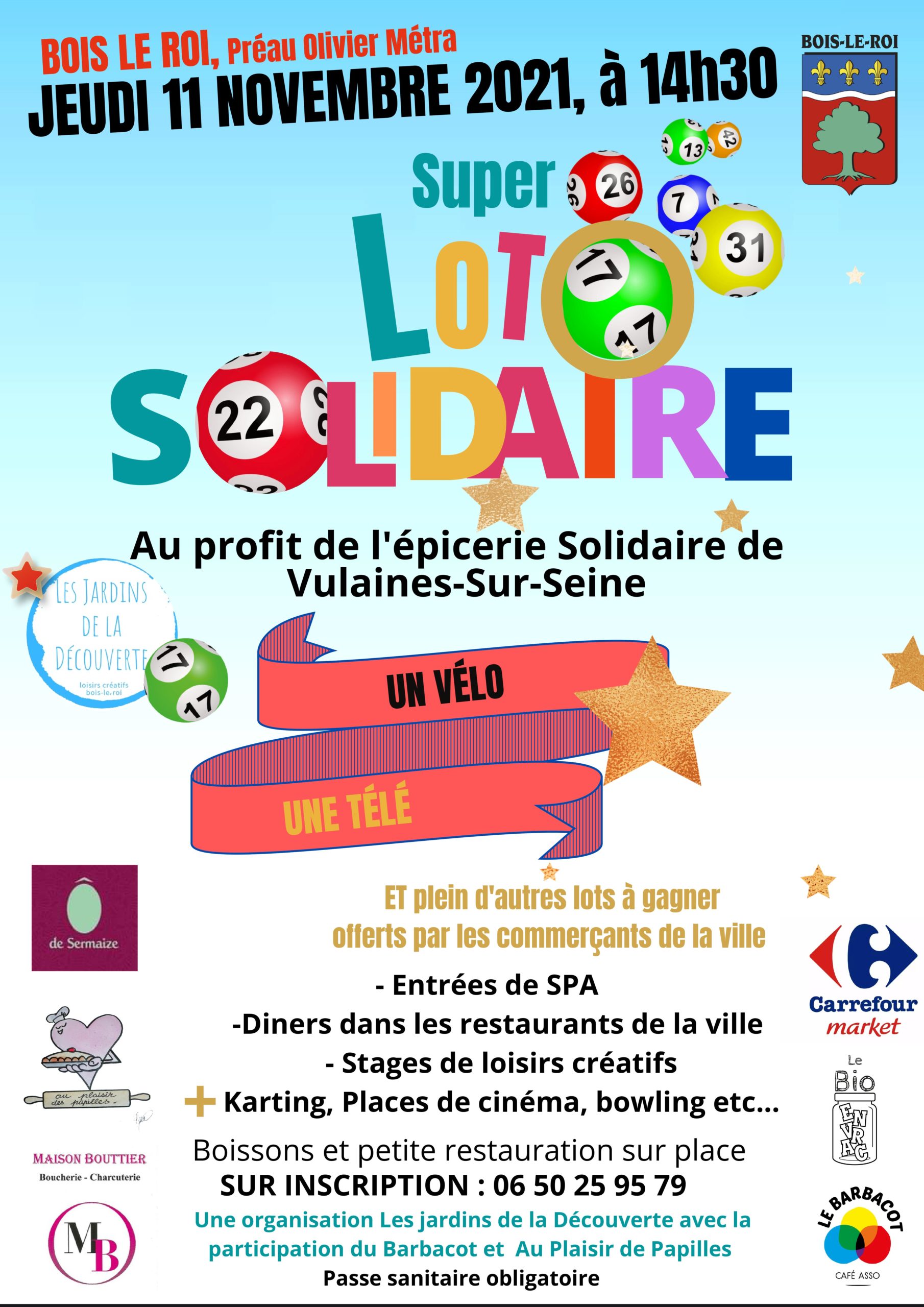 L'association "Les jardins de la découverte" avec la participation des associations du "Barbacot" et du "Plaisir des papilles" proposent un "super loto solidaire" au profit de "l'Epicerie solidaire de Vulaines-sur-Seine.